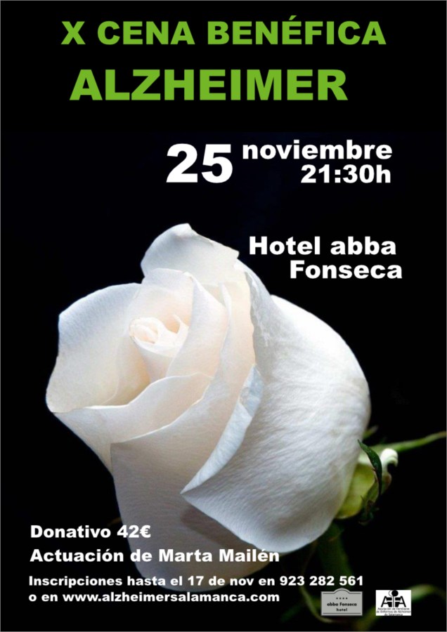 El viernes 25 de Noviembre a las 21:30h en el hotel abba Fonseca, La Asociación de Familiares de Enfermos de Alzheimer celebrará su “X Cena Benéfica”.