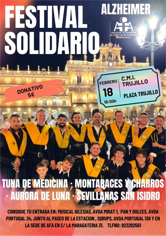 El Festival Solidario es más que un evento de entretenimiento; es una oportunidad para reunirnos y contribuir a la mejora en el bienestar de las personas con Alzheimer usuarias de AFA Salamanca. Les extendemos una cordial invitación a unirse a nosotros en esta maravillosa tarde de música y solidaridad.