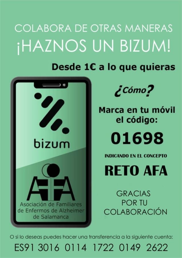 - Haciendo una aportación económica mediante BiZUM Código: 01698 o en el nº de cuenta de AFA en Caja Rural – ES91 3016 0114 1722 0149 2622, poniendo “RETO AFA” o directamente en nuestra web en “Haz un donativo”