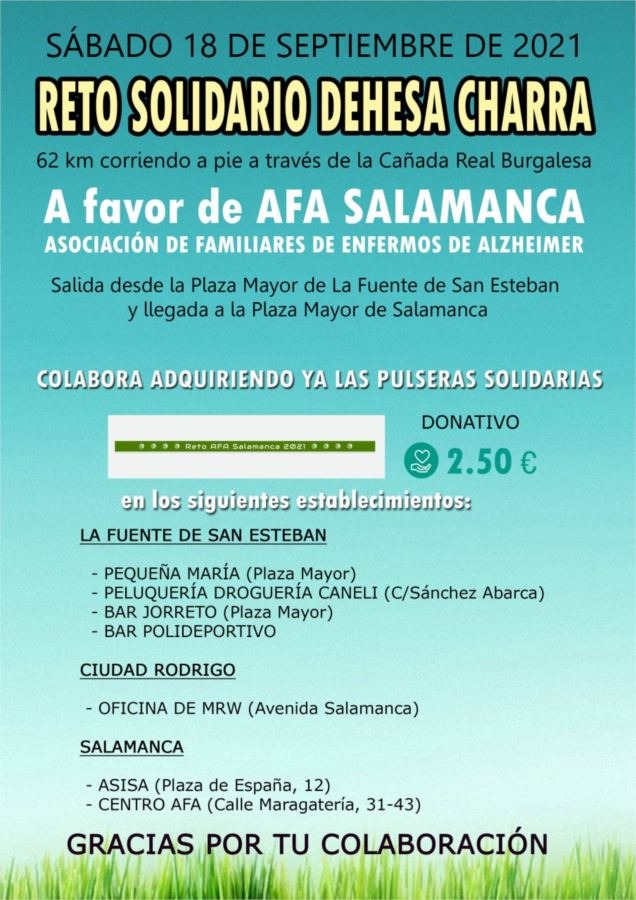 El próximo día 18 de septiembre, coincidiendo con la semana de Alzheimer, Don Jose Roberto Sánchez Moro, corredor de Ultras de Larga distancia y Don Javier García Barbero, corredor de Trail desde hace un año, desinteresadamente, intentarán completar 62 km. a pie, donde cada zancada irá dedicada a todas las personas que sufren esta maldita enfermedad y a todos los trabajadores que los cuidan en AFA Salamanca, tanto en la Residencia, Centro de Día, como en los distintos servicios que posee esta Asociación.