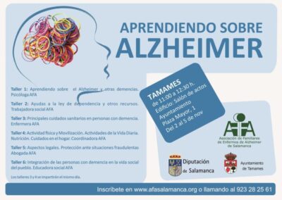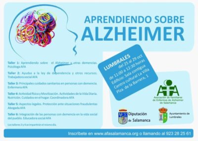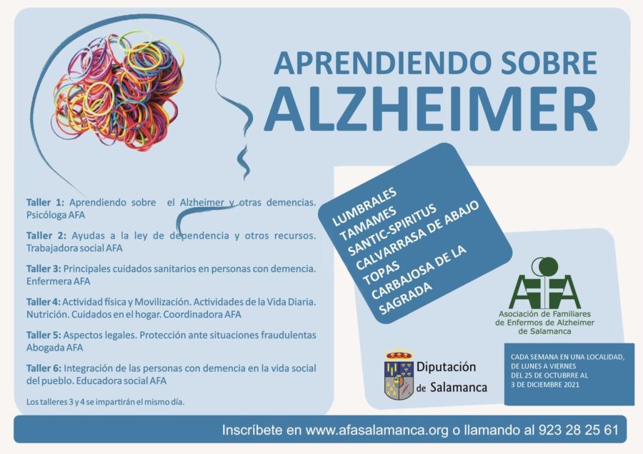 Realización de talleres formativos sobre cuidado y autocuidado de personas afectadas por la enfermedad y personas cuidadoras en 6 municipios de la provincia de Salamanca para el año 2021, estos talleres se realizan bajo un Convenio de colaboración con la EXCMA. Diputación de Salamanca.
