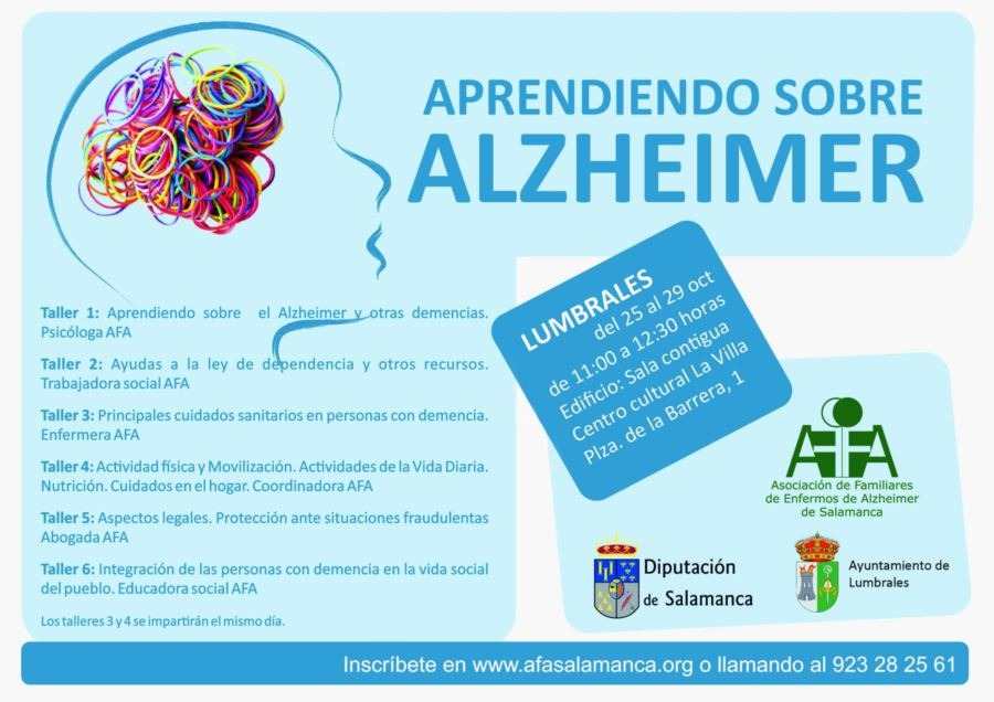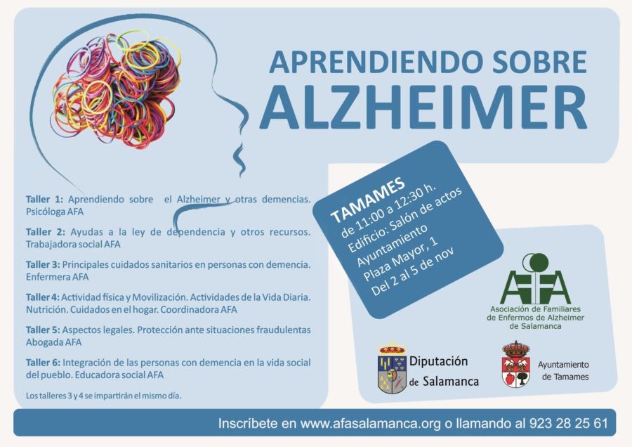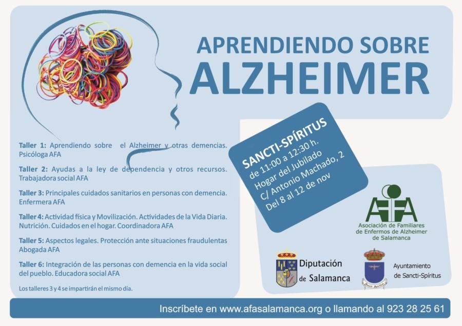 Los talleres tendrán una hora y media de duración y seran impartidos por profesionales de AFA Salamanca, abordando los siguientes temas: