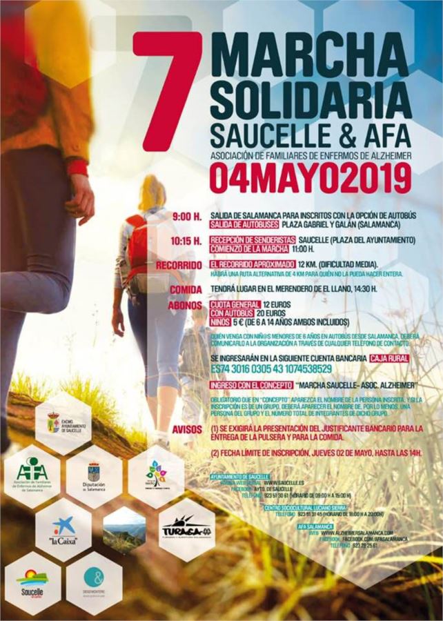 La cuota de inscripción es de 12 euros, 20 euros para quienes cojan el autobús en la capital dispuesto por la organización. Los niños de 6 a 14 años pagarán 5 euros. La cantidad correspondiente deberá ingresarse antes de las 14.00 horas del 2 de mayo en la cuenta de Caja Rural ES74 3016 0305 43 1074538529, haciendo constar como concepto ‘Marcha Saucelle – Asoc. Alzheimer.